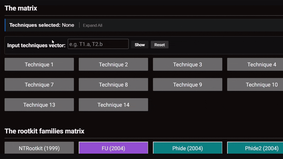 This paper and its new version v2.1, which adds two new rootkit families, can be used as a reference to find information about existing rootkit families. However, the guide can’t provide an interactive experience to navigate through rootkit techniques online. The Rootkit Techniques Matrix provides this experience, allowing to easily navigate all techniques and create a vector to refer to them. All information for the matrix was taken from the guide.