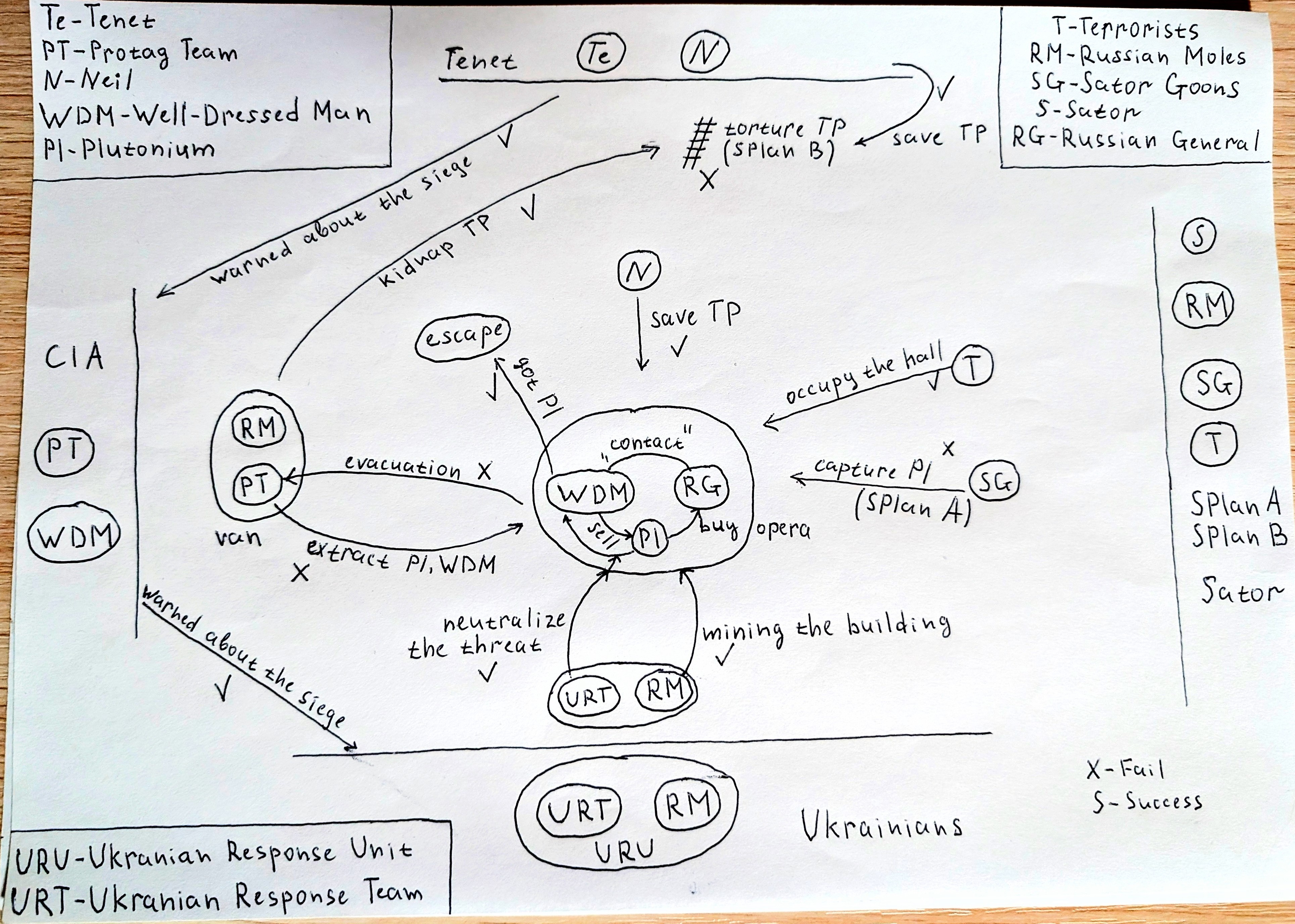 The Ukrainian SWAT team also includes “moles” - mercenaries affiliated with Sator. Their task is to mine the building with explosives to disguise the event as a terrorist attack where the audience is merely “collateral damage”. Meanwhile, the “private Russians” in the van are the backup. Their job is to kidnap and interrogate TP and the WDM to find the plutonium’s location if plan A fails. Finally, there is Neil, who saves TP’s life by catching an inverted bullet. It is believed that TP and the other survivor were rescued from the Russians by Tenet.