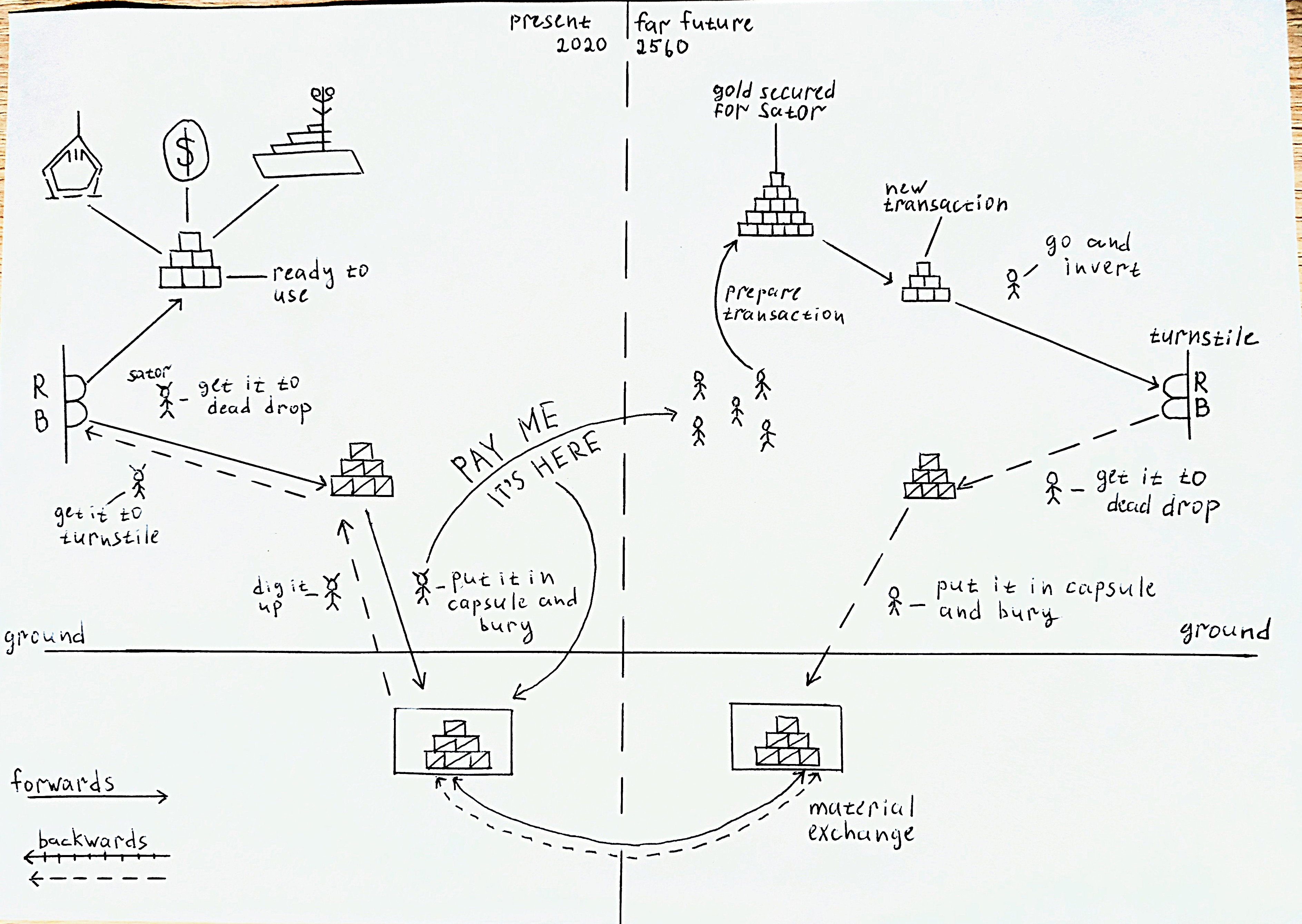 When working with inverted material, cause and effect switch places. From the inverted gold’s perspective, it should be dug up and brought to the turnstile, but from Sator’s perspective, it appears in the turnstile, then he puts it in the capsule and buries it. Why does the gold appear in the turnstile from nowhere? Because Sator intended for this action to happen. In the turnstile, Sator sees two stacks of gold - inverted and forward. He brings the inverted one to the dead drop, puts it in the capsule, buries it, and transmits the coordinates to the future.
