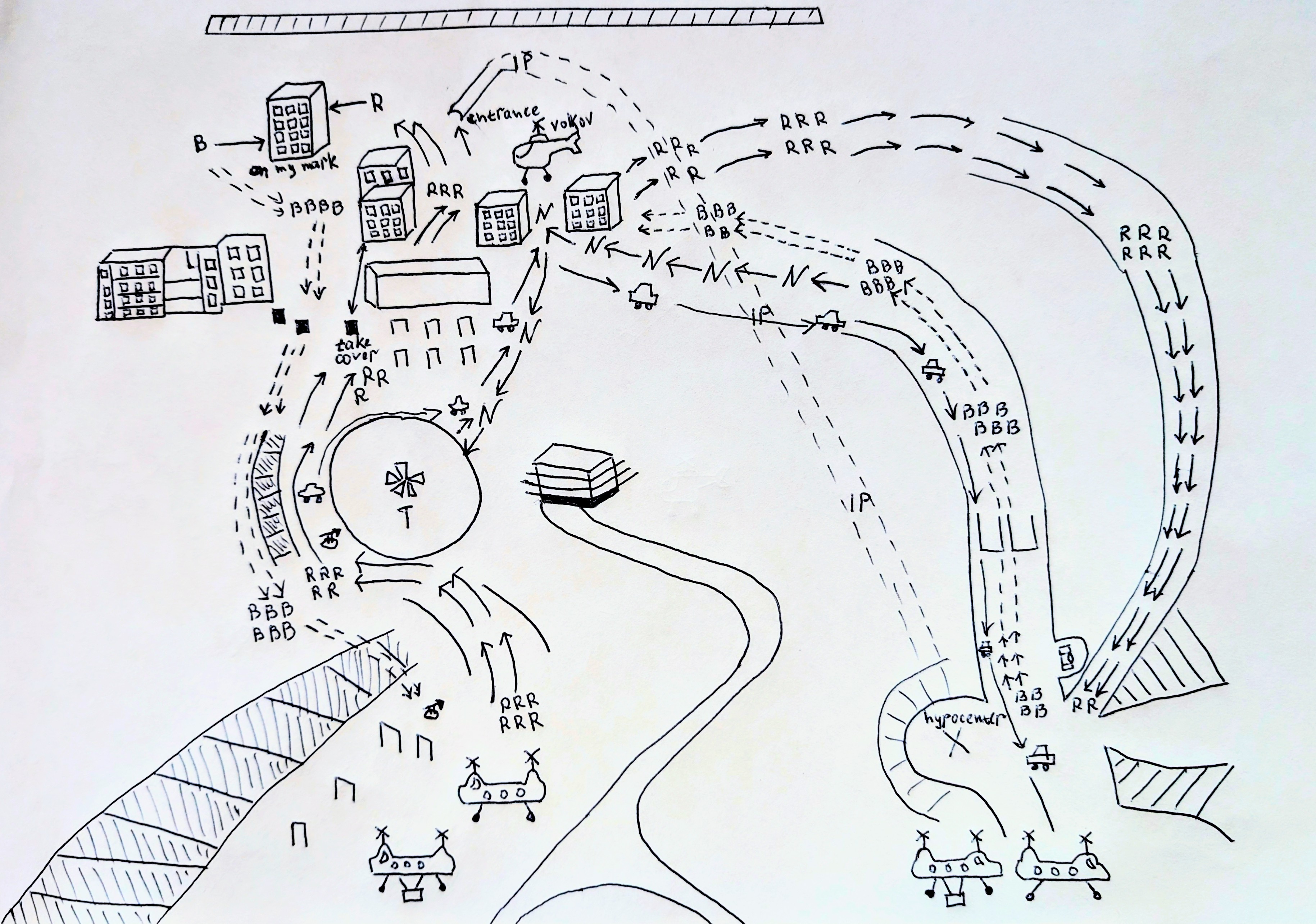 The Blue team lands on the ridge above the hypocenter minutes before the explosion. When the soldiers exit the containers, they see the Red team disembarking from the choppers. TP and Ives are a splinter unit tasked with the mission of lifting the assembled Algorithm before the countdown goes off. Neil, in turn, reverts on the battlefield when he sees Volkov setting a tripwire at the entrance to the hypocenter.
