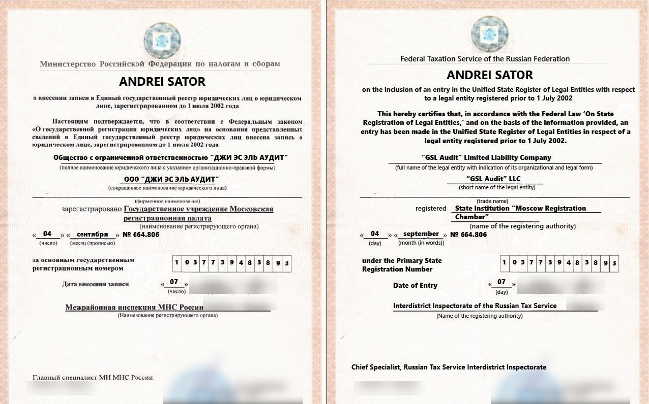 The document we see in the capsule is actually called «Свидетельство о внесении записи в Единый государственный реестр юридических лиц», which translates to English as “Certificate of Entry in the Unified State Register of Legal Entities.” This is the main document issued by the Federal Taxation Service (Федеральная Налоговая Служба) and is used to officially register a business in the Russian Federation. In the United States, its closest equivalent would be an Employer Identification Number (EIN), which is assigned by the IRS to business entities operating in the U.S.